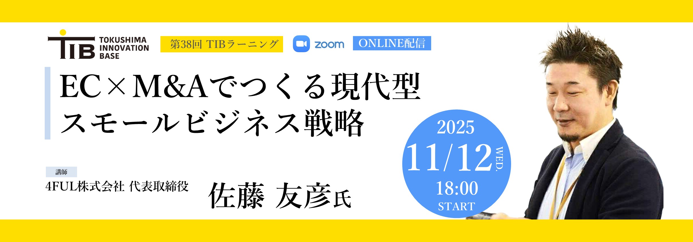 - 【Zoom配信】【第38回TIBラーニング】4FUL株式会社 プレゼンツ!「EC×M&Aでつくる現代型スモールビジネス戦略」11月12日( 水 ) 18:00〜19:30 オンライン配信で開催
